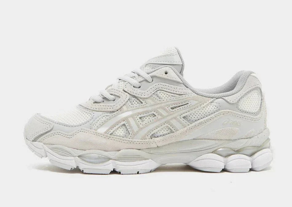 Frischen Sie Ihre Garderobe mit diesen Damen-Sneakers GEL-NYC von ASICS auf. Die Laufschuhe in Creme und Wolkengrau verfügen über ein atmungsaktives Mesh-Obermaterial mit weichen Leder- und Synthetik-Overlays für lange Haltbarkeit. Sie bieten einen farblich abgestimmten Schnürverschluss mit weicher Polsterung am Knöchelkragen für optimalen Halt und eine leichte Schaumstoff-Mittelsohle mit GEL Tech-Dämpfung für unübertroffenen Tragekomfort. Die robuste Gummiaußensohle sorgt für sicheren Halt und das ikonische ASICS-Logo rundet das Design ab.